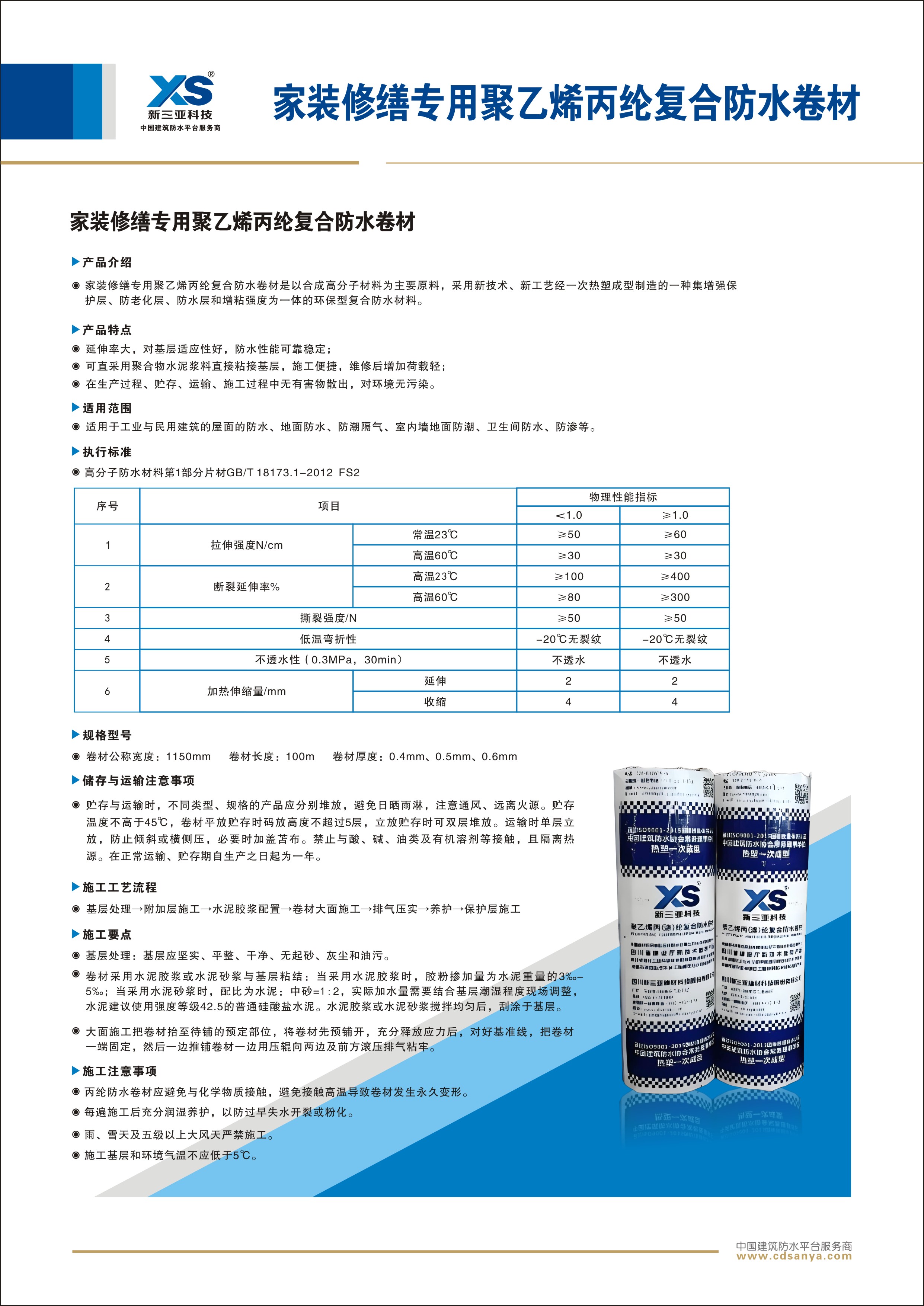 產(chǎn)品簡介: 乙烯丙綸復(fù)合防水卷材是以合成高分子材料為主要原料,采用新技術(shù)、新工藝經(jīng)一次熱塑成型制造的一種集增強(qiáng)保護(hù)層、防老化層、防水層和增粘強(qiáng)度為一體的環(huán)保型復(fù)合防水材料。 規(guī)格: FS2-PE-0.5mm 1.15m×100m | ![]() | ![]() |